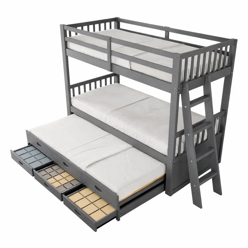Lit superposé moderne avec lit coulissant et échelle, parfait pour accueillir plusieurs enfants confortablement.